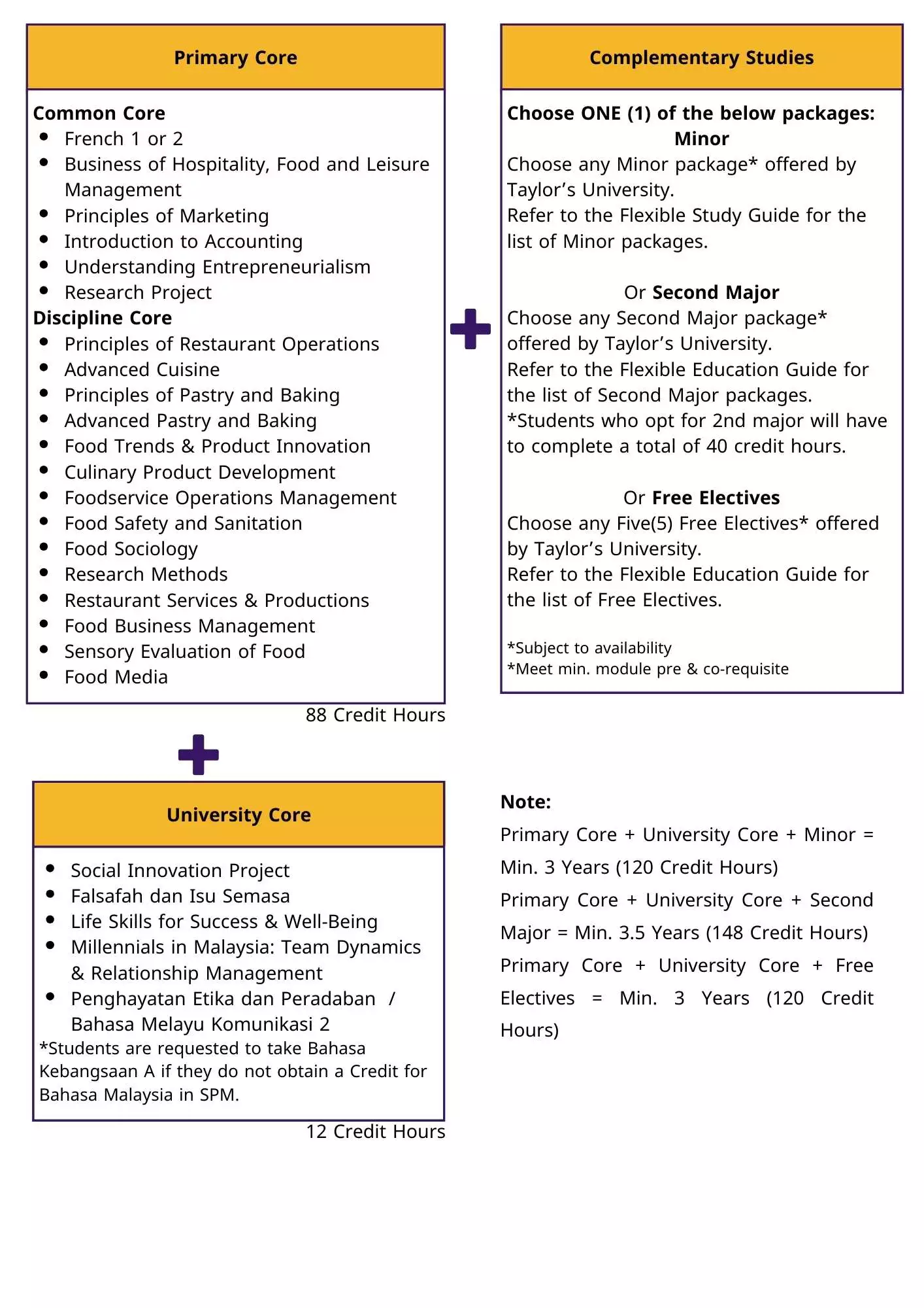 The Bachelor of Culinary Management (Honours) Program at Taylor's University Malaysia is designed to provide students with practical knowledge and skills in foodservice management, culinary arts, and global culinary industry practices. The curriculum emphasizes key competencies in culinary, culinary management, pastry, and business management. By combining technical and managerial skills, the program prepares students for careers in the food and beverage industry.